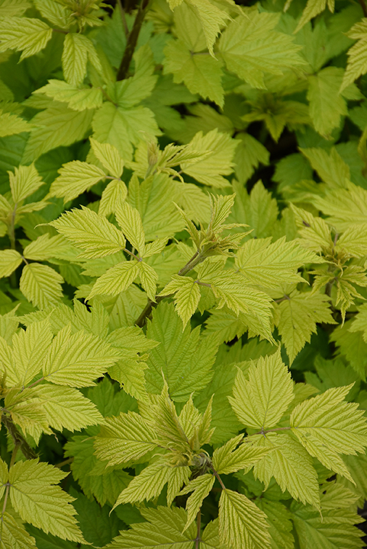 Golden Ruby Salmonberry features dainty fragrant hot pink star-shaped flowers at the ends of the branches from late spring to early summer. It has gold deciduous foliage which emerges chartreuse in spring. The crinkled pointy compound leaves turn yellow in fall.