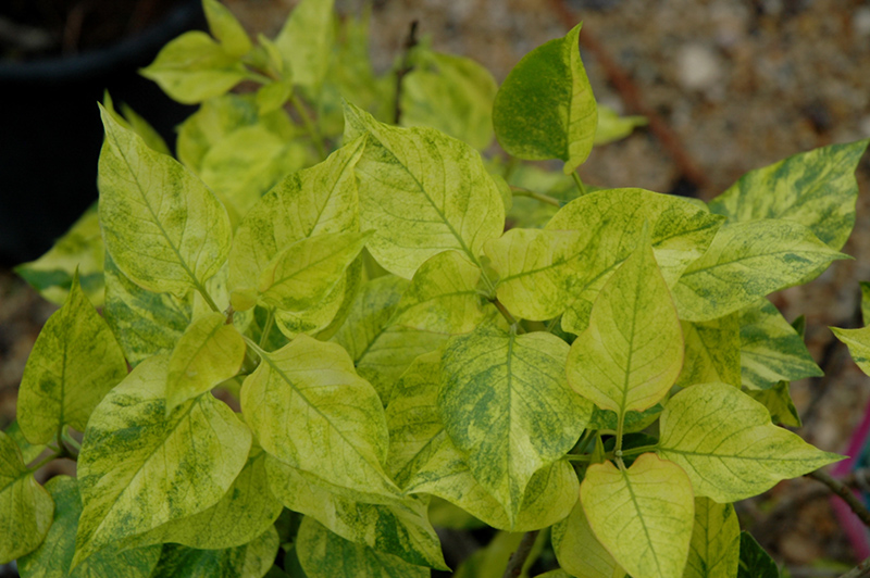 A truly different lilac, whose bright magenta flowers are complemented by the intense yellow-cream variegated foliage; upright, multi-stemmed habit, very hardy, ideal for screening; full sun and well-drained soil, allow room for air movement