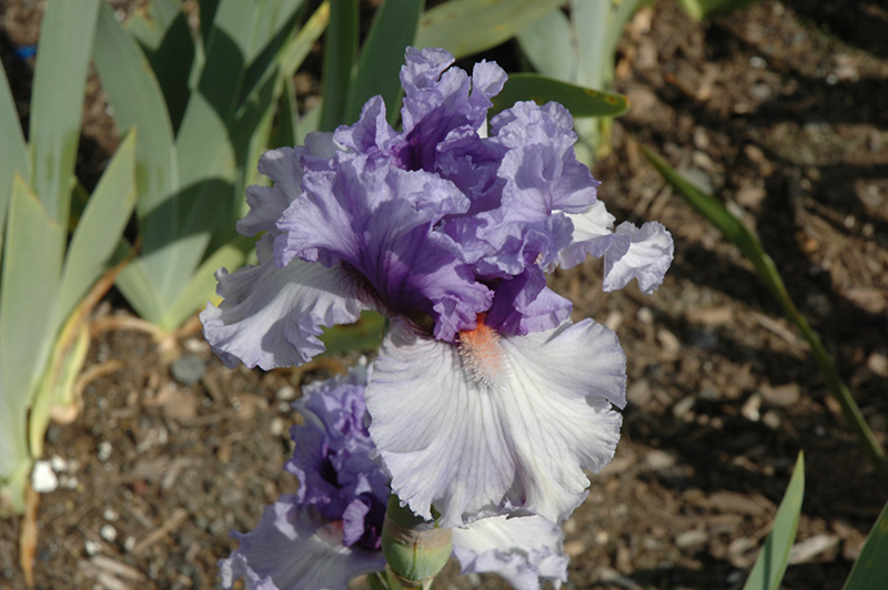 This exquisite iris produces ruffled lavender-blue blooms with creamy white falls and orange beards; a stunning addition to the perennial border; also excellent massed in groupings in the garden; will quickly form dense colonies