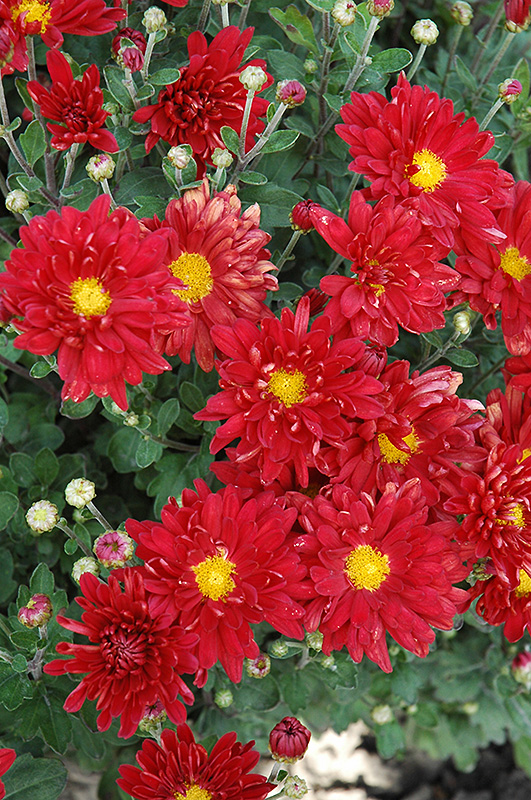 Firestorm® Chrysanthemum is smothered in stunning semi-double scarlet daisy flowers with yellow eyes at the ends of the stems from early to late fall. The flowers are excellent for cutting. Its fragrant ferny leaves remain green in colour throughout the season.