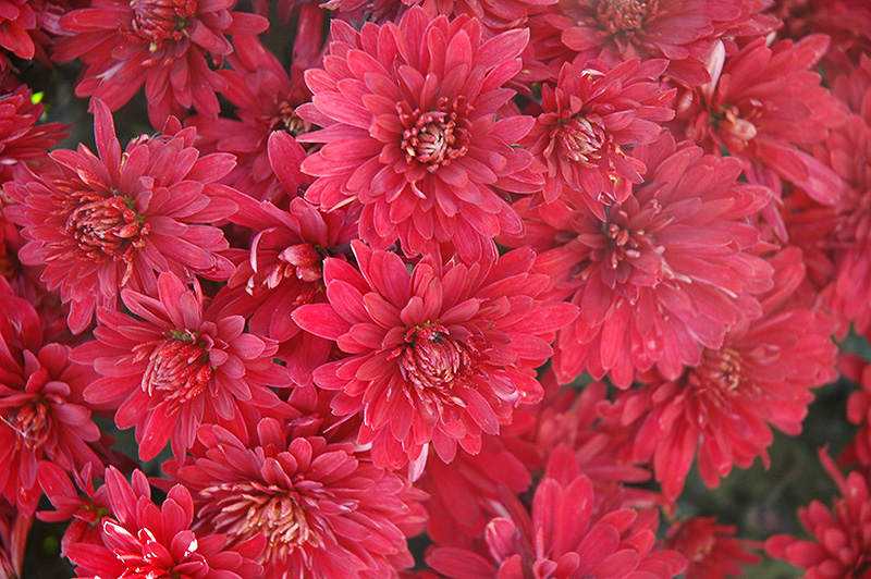 Minngopher Chrysanthemum is smothered in stunning double ruby-red daisy flowers at the ends of the stems from early to late fall. The flowers are excellent for cutting. Its fragrant ferny leaves remain green in colour throughout the season.