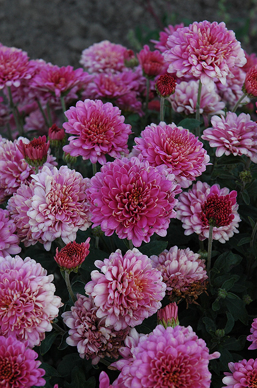 Showbiz Chrysanthemum is smothered in stunning fully double violet daisy flowers with pink overtones at the ends of the stems from early to late fall. The flowers are excellent for cutting. Its fragrant ferny leaves remain green in colour throughout the season.