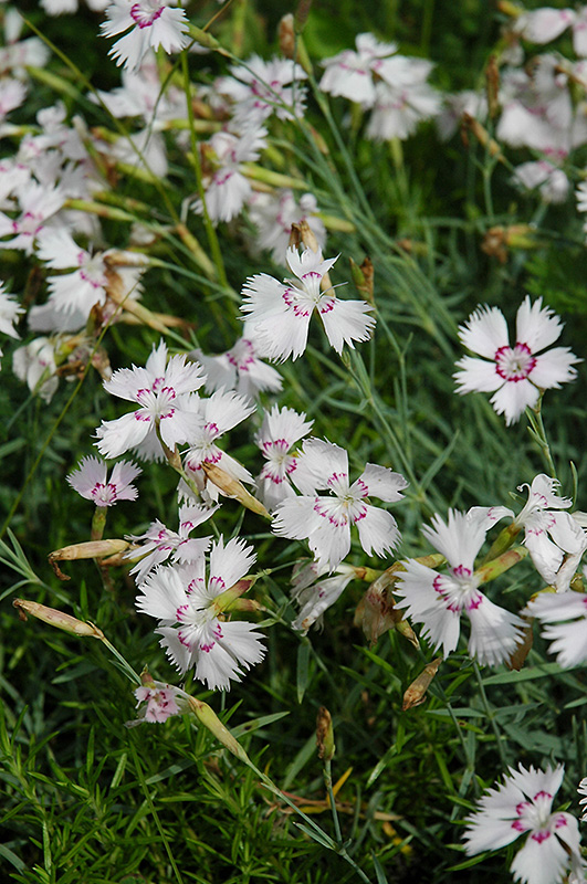 A vigorous selection featuring white frilly flowers with crimson red centers, blanketing mounded gray-green foliage; blooms from late spring to mid summer; excellent in fresh-cut arrangements; wonderful used in rock gardens, borders, beds or containers