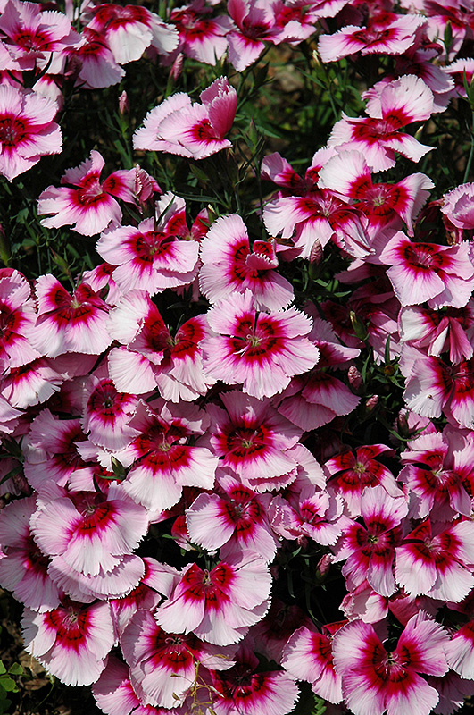 Corona™ Cherry Magic Pinks will grow to be about 8 inches tall at maturity extending to 12 inches tall with the flowers, with a spread of 12 inches. When grown in masses or used as a bedding plant, individual plants should be spaced approximately 8 inches apart. Its foliage tends to remain low and dense right to the ground. It grows at a medium rate, and under ideal conditions can be expected to live for approximately 5 years. As an evegreen perennial, this plant will typically keep its form and foliage year-round.