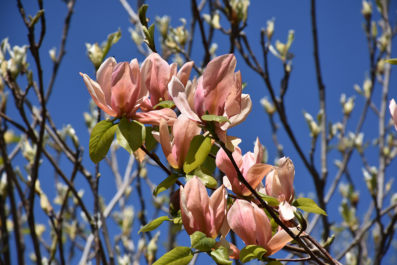 Coral Reef Magnolia is covered in stunning fragrant pink cup-shaped flowers with salmon overtones held atop the branches in mid spring before the leaves. It has dark green deciduous foliage. The large pointy leaves turn coppery-bronze in fall.