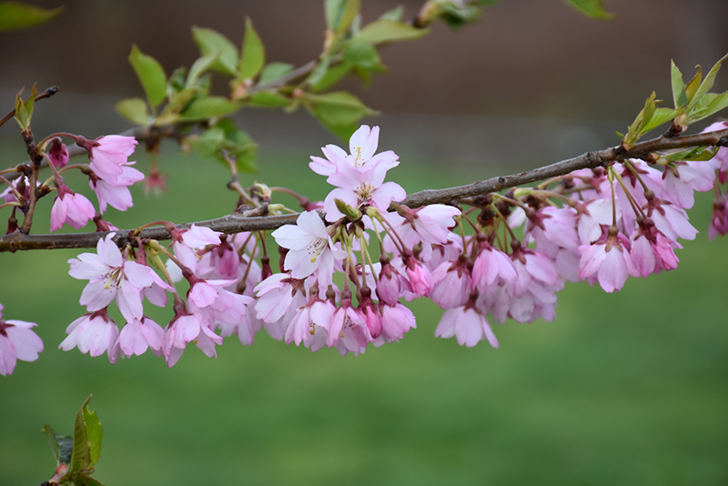 Whitcomb Higan Cherry is clothed in stunning clusters of fragrant shell pink flowers along the branches in early spring, which emerge from distinctive pink flower buds before the leaves. It has dark green deciduous foliage. The glossy pointy leaves turn outstanding shades of orange, gold and yellow in the fall. The fruits are showy black drupes displayed in early fall. The smooth dark red bark adds an interesting dimension to the landscape.