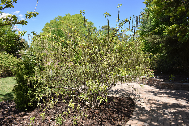 Carolina Parakeet Variegated Spiketail is bathed in stunning racemes of yellow bell-shaped flowers with chartreuse overtones hanging below the branches from early to mid spring before the leaves. It has attractive yellow-variegated dark green foliage which emerges coppery-bronze in spring. The oval leaves are highly ornamental but do not develop any appreciable fall colour. The smooth brown bark adds an interesting dimension to the landscape.