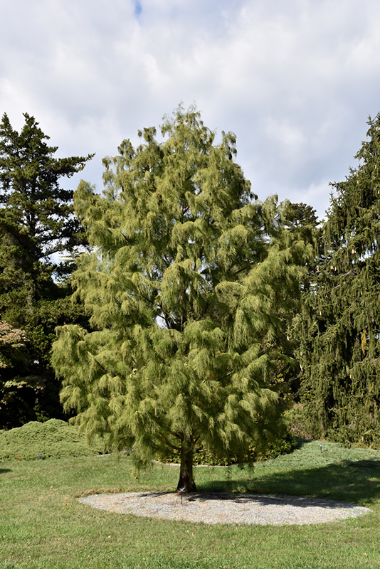 A particularly beautiful deciduous conifer with lovely pendulous foliage along its formal pyramidal habit; narrow bright green leaves turn bronze in fall, a broad trunk and odd knee-like protrusions at the base when grown in standing water; very adaptable