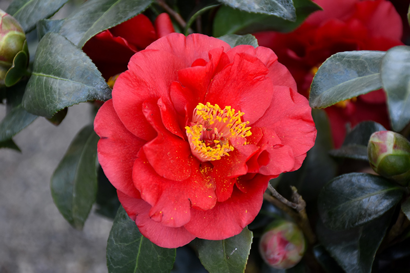 Blood Of China Camellia features showy semi-double crimson round flowers with yellow eyes at the ends of the branches from late winter to early spring. It has dark green evergreen foliage. The glossy pointy leaves remain dark green throughout the winter.