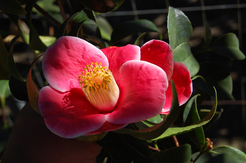 Tama-no-ura Camellia features showy red round flowers with yellow eyes and white edges at the ends of the branches from late winter to early spring. It has dark green evergreen foliage. The glossy pointy leaves remain dark green throughout the winter.