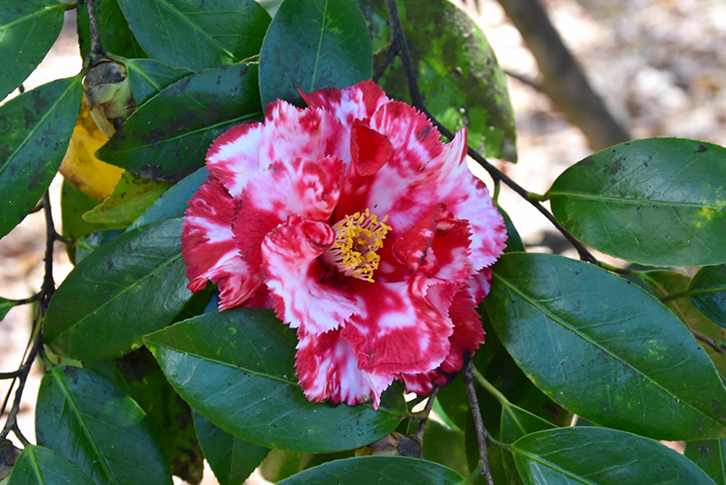 Lustrous evergreen foliage cover this upright shrub; masses of striking deep red, semi-double flowers with dashes of white, bloom from late winter to early spring; provide rich, acidic, moist, well-drained soil
