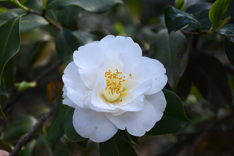 White Queen Camellia features showy semi-double white round flowers with yellow eyes at the ends of the branches from late winter to early spring. It has dark green evergreen foliage. The glossy pointy leaves remain dark green throughout the winter.