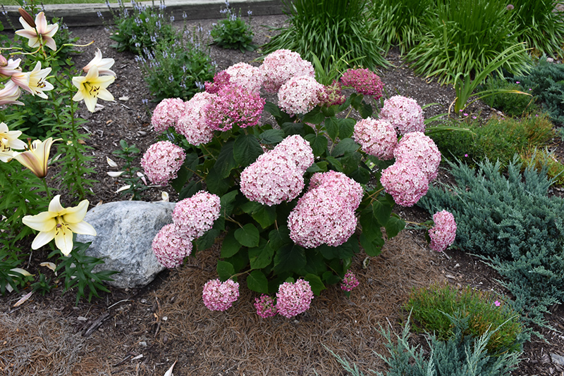 Incrediball® Blush Smooth Hydrangea features bold balls of pink flowers with silver overtones at the ends of the branches from mid to late summer. The flowers are excellent for cutting. It has dark green deciduous foliage. The heart-shaped leaves do not develop any appreciable fall colour.