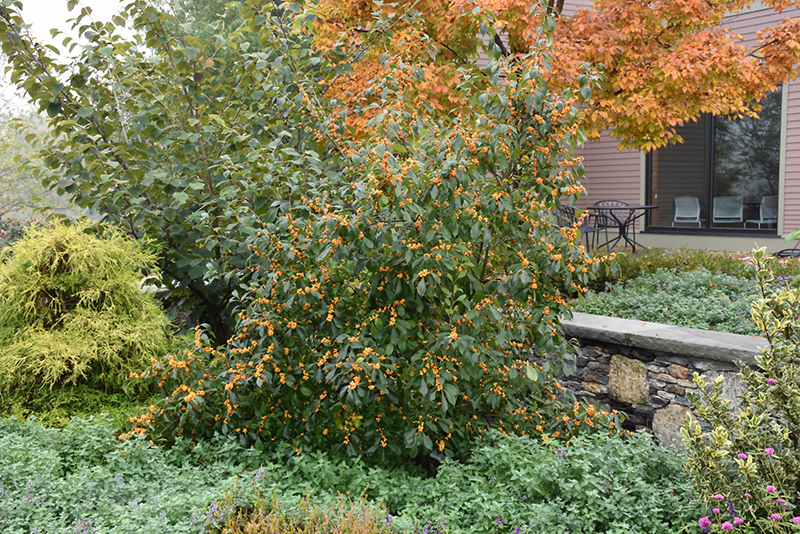 An interesting and showy fall shrub known for its bright yellow fruit; sheds leaves early in fall to reveal berries; use the Golden Verboom male for pollination; great in masses and particularly wet sites, needs acidic soil