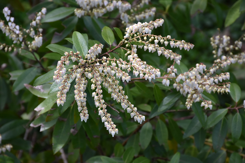 Mountain Pieris features dainty chains of fragrant white bell-shaped flowers hanging below the branches in early spring. It has attractive dark green evergreen foliage. The glossy oval leaves are highly ornamental and remain dark green throughout the winter.