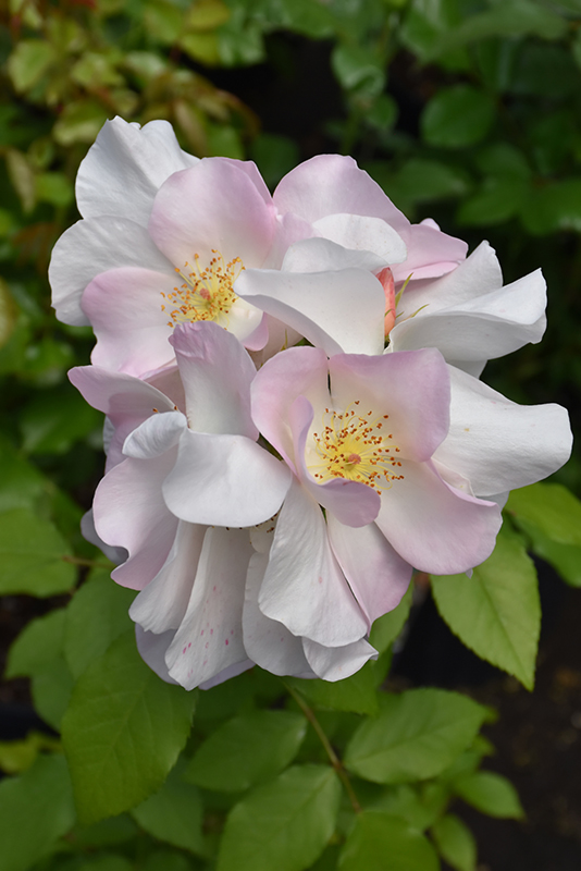 Sally Holmes Rose features showy lightly-scented white flowers with gold eyes and shell pink streaks along the branches from early to late summer, which emerge from distinctive peach flower buds. The flowers are excellent for cutting. It has dark green deciduous foliage. The glossy oval compound leaves do not develop any appreciable fall colour.