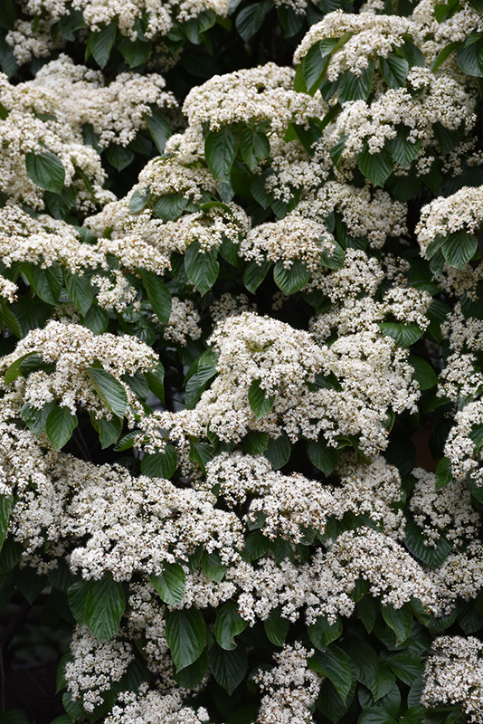 Chippewa Viburnum features showy clusters of lightly-scented creamy white flowers at the ends of the branches in mid spring, which emerge from distinctive rose flower buds. The dark red fruits which fade to black over time are held in abundance in spectacular clusters from late summer to late fall. It has dark green evergreen foliage. The textured round leaves turn outstanding shades of scarlet and in the fall, which persists throughout the winter.