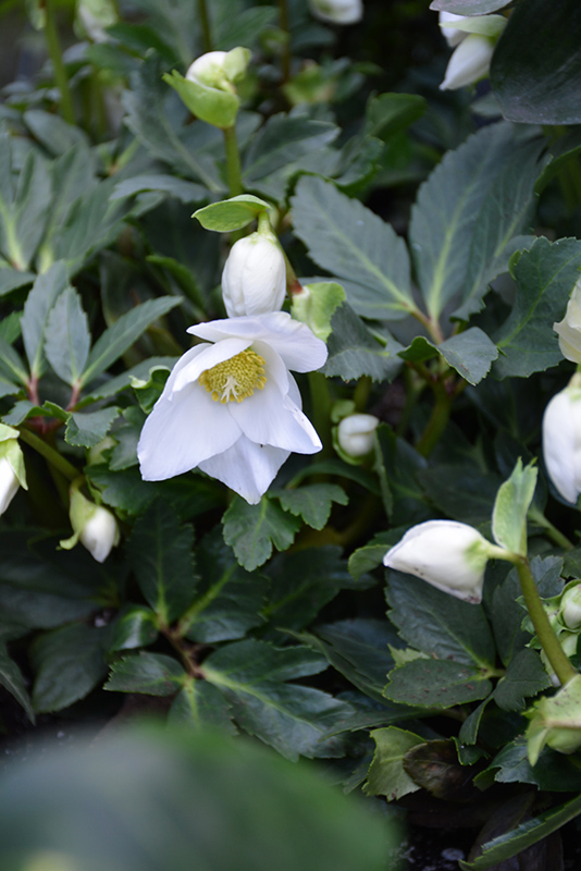 This attractive variety produces bushy mounds of thick evergreen leaves; elegant, gently nodding cups are snowy white with a small green center; a great selection for shade gardens
