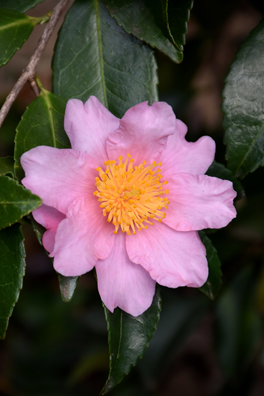Winter's Fancy Camellia features showy semi-double pink round flowers with purple overtones and yellow eyes at the ends of the branches from mid fall to early winter. It has dark green evergreen foliage. The small glossy pointy leaves remain dark green throughout the winter.