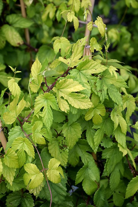 Summer Shandy™ Hops' attractive tomentose lobed leaves emerge chartreuse in spring, turning gold in colour with showy yellow variegation and tinges of lime green throughout the season on a plant with a spreading habit of growth. It produces small clusters of buttery yellow hop-like fruit from mid summer to mid fall.