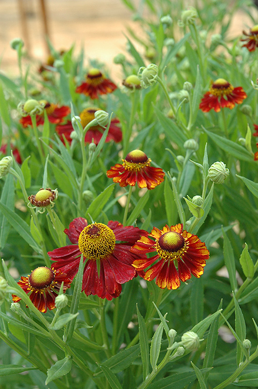 Rubenzwerg Sneezeweed will grow to be about 24 inches tall at maturity extending to 3 feet tall with the flowers, with a spread of 24 inches. When grown in masses or used as a bedding plant, individual plants should be spaced approximately 18 inches apart. The flower stalks can be weak and so it may require staking in exposed sites or excessively rich soils. It grows at a fast rate, and under ideal conditions can be expected to live for approximately 10 years. As an herbaceous perennial, this plant will usually die back to the crown each winter, and will regrow from the base each spring. Be careful not to disturb the crown in late winter when it may not be readily seen!
