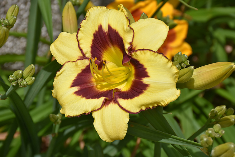 This reblooming daylily produces creamy-yellow trumpets with a burgundy-red ring around a yellow-green throat; pretty ruffled blooms that are sturdy, strong, and easy to care for; great grassy texture and form; good for the beginner gardener and the pro