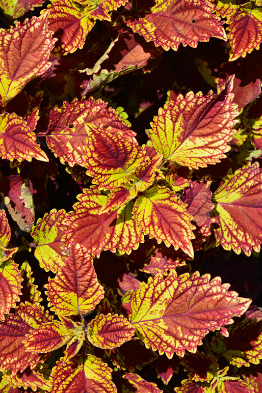 Color Clouds™ Be Mine Coleus' attractive serrated pointy leaves emerge dark red in spring, turning brick red in colour with showy chartreuse variegation and tinges of purple the rest of the year on a plant with an upright spreading habit of growth.