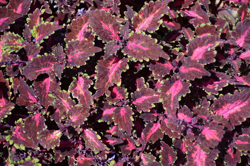 Globetrotters™ Gaga Coleus' attractive serrated pointy leaves remain hot pink in colour with distinctive chartreuse edges and tinges of dark red throughout the year on a plant with a mounded habit of growth.