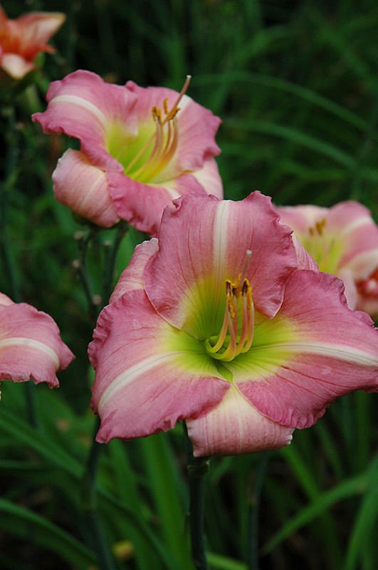 Rosy-pink flowers with ruffled edges, chartreuse eyes and white stipes; low growing mounds of arching, green foliage; low maintenance and easy to grow, perfect for borders, beds and rock gardens; drought tolerant once established