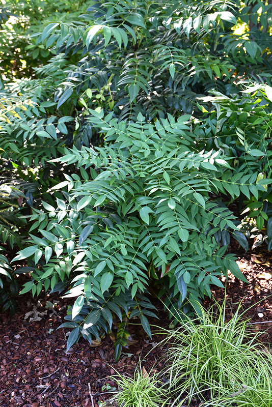 A showy upright-mounded shrub with pinnate oval leaves that bronze in winter; showy yellow flowers in spring become clusters of wax-coated black berries in late summer; somewhat fussy, needs moist acid soils, some shade and protection from winter winds