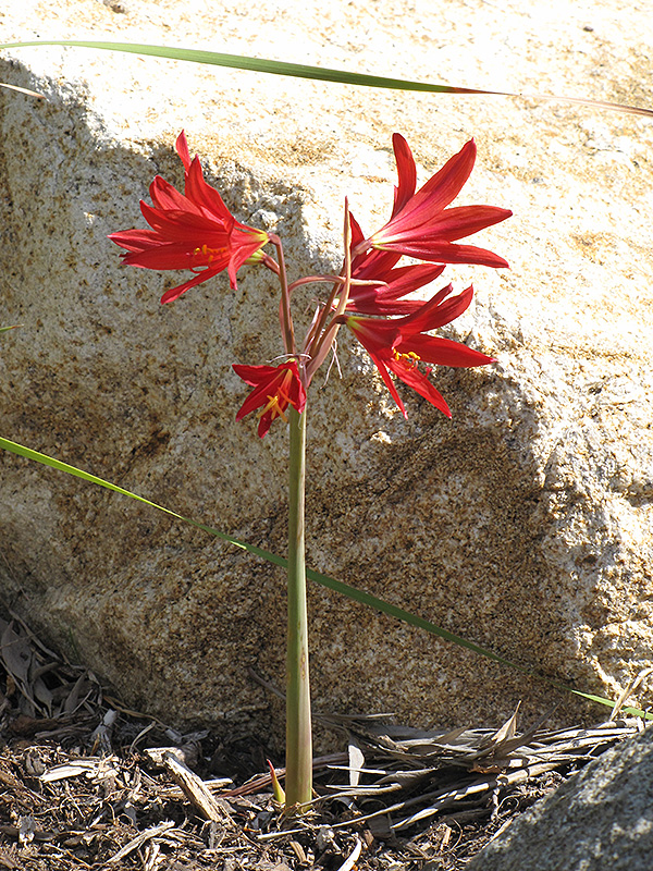 This vigorous bulb variety produces narrow leaves in fall, that persist until the following spring, then die away; stunning clusters of blood-red trumpet blooms appear on stalks in late summer to early fall; an amazing accent plant for the fall garden