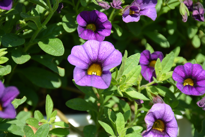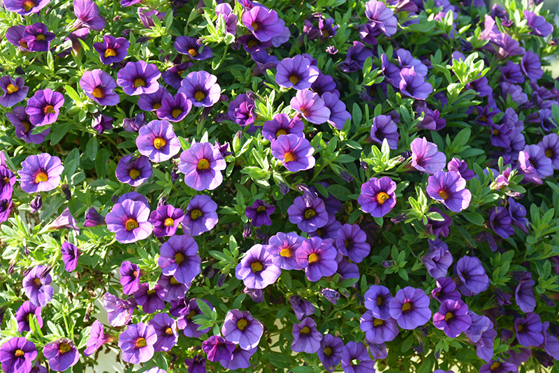 Million Bells® Mounding Blue Calibrachoa is draped in stunning violet trumpet-shaped flowers with blue overtones and yellow throats at the ends of the stems from late spring to early fall. Its small pointy leaves remain green in colour throughout the season.