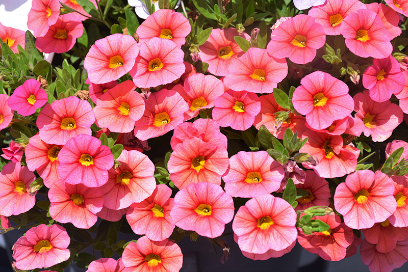 Superbells® Coralina Calibrachoa is clothed in stunning coral-pink trumpet-shaped flowers with yellow throats and red veins at the ends of the stems from late spring to early fall. Its small pointy leaves remain green in colour throughout the season.