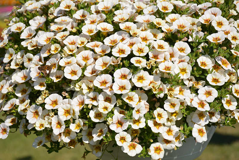 Superbells® Frostfire Calibrachoa is blanketed in stunning creamy white trumpet-shaped flowers with yellow throats and dark red veins at the ends of the stems from late spring to early fall. Its small pointy leaves remain green in colour throughout the season.