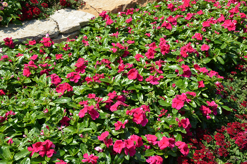 Cora® Cascade Magenta Vinca will grow to be about 14 inches tall at maturity, with a spread of 24 inches. Its foliage tends to remain dense right to the ground, not requiring facer plants in front. Although it's not a true annual, this fast-growing plant can be expected to behave as an annual in our climate if left outdoors over the winter, usually needing replacement the following year. As such, gardeners should take into consideration that it will perform differently than it would in its native habitat.
