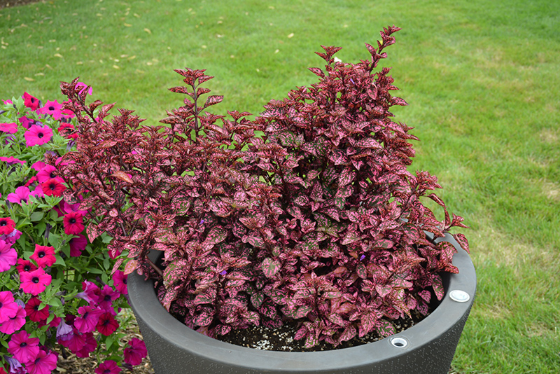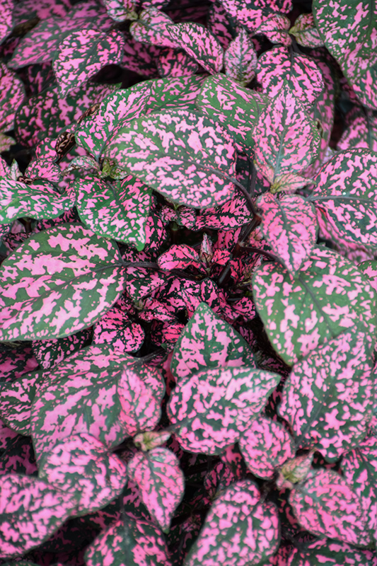 This spectacular, eye catching plant presents shiny dark green leaves that are splashed and dotted with rose pink, creating a vibrant color contrast in the garden or containers; heat tolerant, and does well in sun or shade
