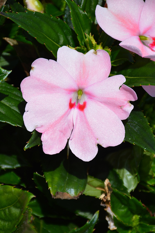 SunPatiens® Spreading Pink Kiss New Guinea Impatiens features bold shell pink round flowers with white overtones and a red blotch at the ends of the stems from mid spring to early fall. Its glossy pointy leaves remain dark green in colour throughout the season.