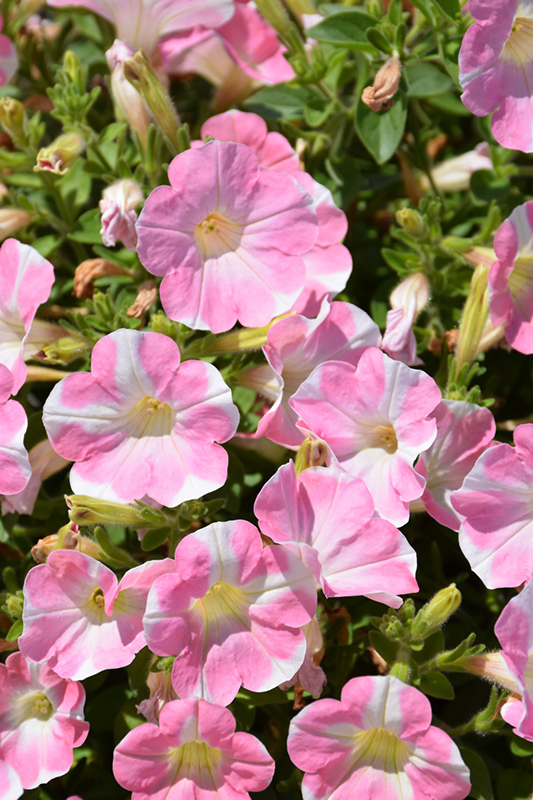 Surfinia® Heartbeat Petunia will grow to be about 8 inches tall at maturity, with a spread of 16 inches. When grown in masses or used as a bedding plant, individual plants should be spaced approximately 12 inches apart. Its foliage tends to remain low and dense right to the ground. This fast-growing annual will normally live for one full growing season, needing replacement the following year.