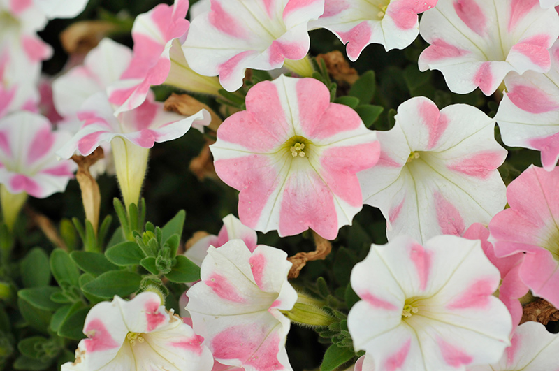 Surfinia® Heartbeat Petunia is covered in stunning white trumpet-shaped flowers with chartreuse throats and shell pink spots at the ends of the stems from mid spring to mid fall. Its pointy leaves remain green in colour throughout the season.