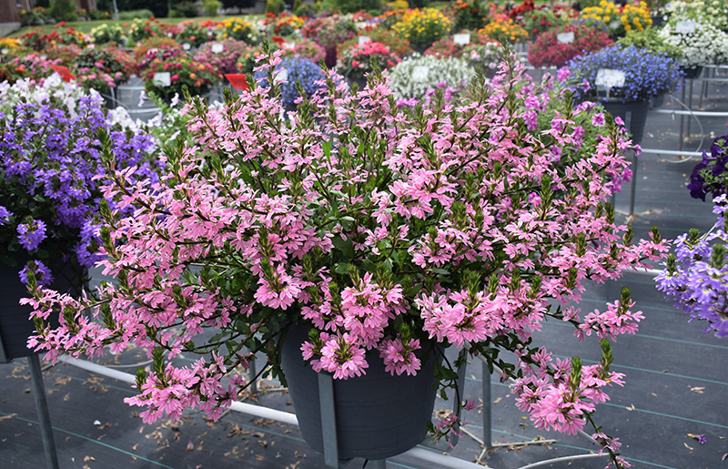 Whirlwind® Pink Fan Flower is an herbaceous annual with a trailing habit of growth, eventually spilling over the edges of hanging baskets and containers. Its relatively fine texture sets it apart from other garden plants with less refined foliage.