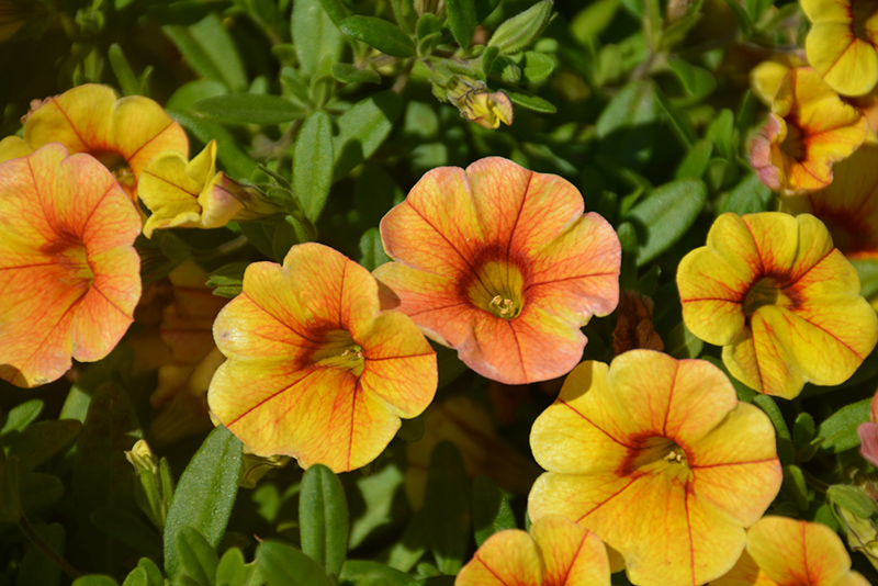 Kimono™ Tokyo Sunset Calibrachoa is blanketed in stunning gold trumpet-shaped flowers with yellow throats and scarlet centers at the ends of the stems from late spring to early fall. Its small oval leaves remain green in colour throughout the season.