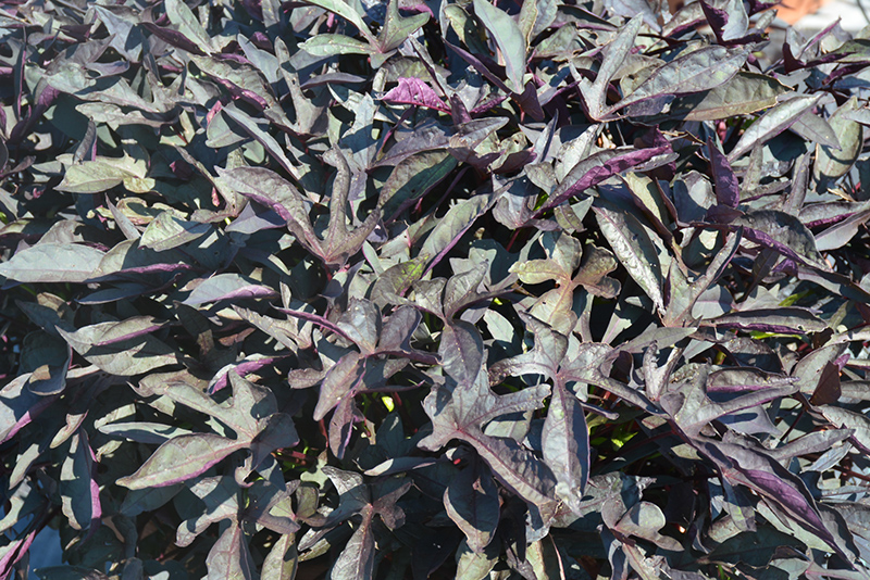 South of the Border™ Black Beans Sweet Potato Vine will grow to be about 8 inches tall at maturity, with a spread of 3 feet. When grown in masses or used as a bedding plant, individual plants should be spaced approximately 12 inches apart. Its foliage tends to remain low and dense right to the ground. This fast-growing annual will normally live for one full growing season, needing replacement the following year.