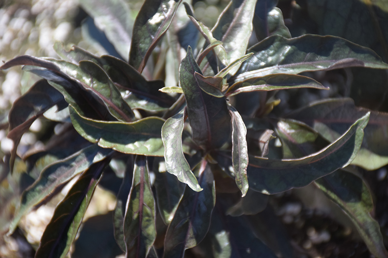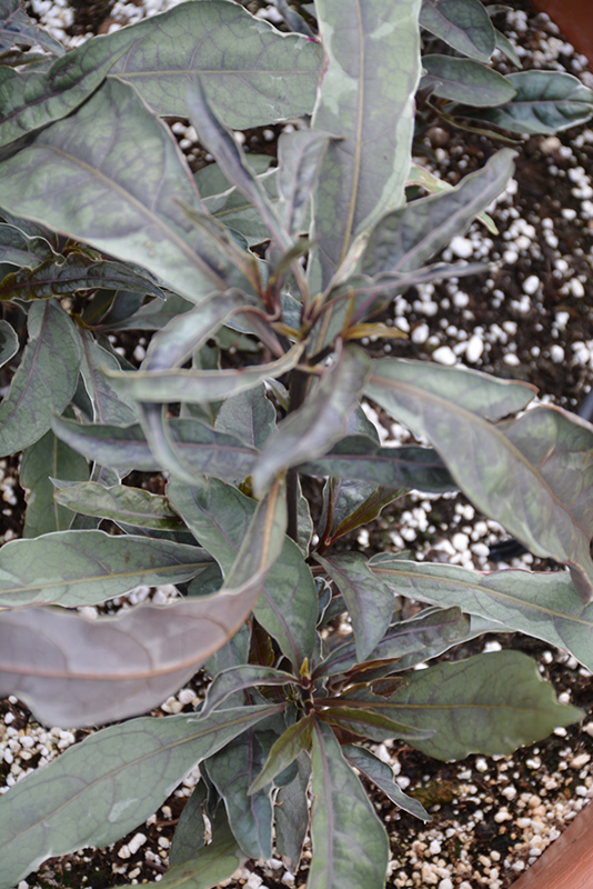 Stainless Steel False Eranthemum's attractive glossy oval leaves remain grayish green in colour with showy dark gray variegation and tinges of silver throughout the year on a plant with an upright spreading habit of growth. It features dainty white star-shaped flowers with purple spots along the stems from mid to late summer. The black stems can be quite attractive.