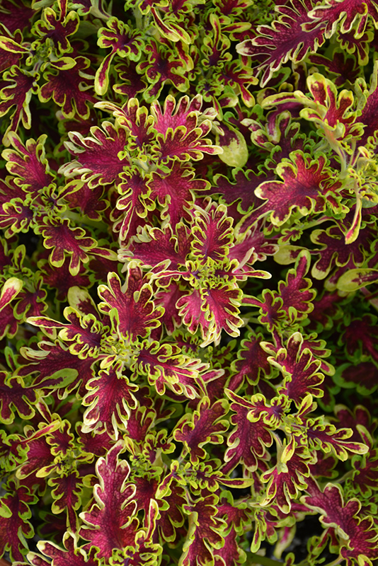 Under The Sea™ Electric Coral Coleus' attractive deeply cut lobed leaves remain crimson in colour with distinctive chartreuse edges and tinges of violet throughout the year on a plant with a mounded habit of growth.