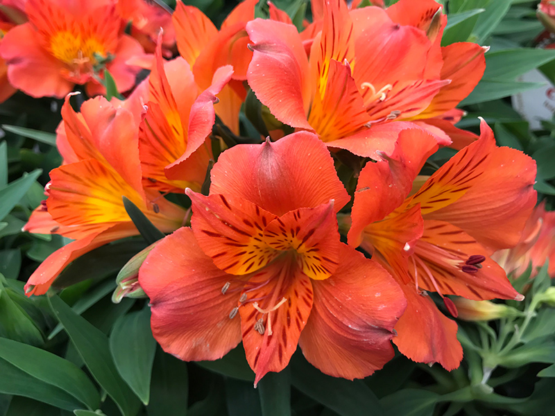 Colorita® Amina® Alstroemeria features showy bracted orange trumpet-shaped flowers with yellow throats and burgundy stripes at the ends of the stems from late spring to mid fall. The flowers are excellent for cutting. Its attractive twisted pointy leaves remain dark green in colour throughout the season.