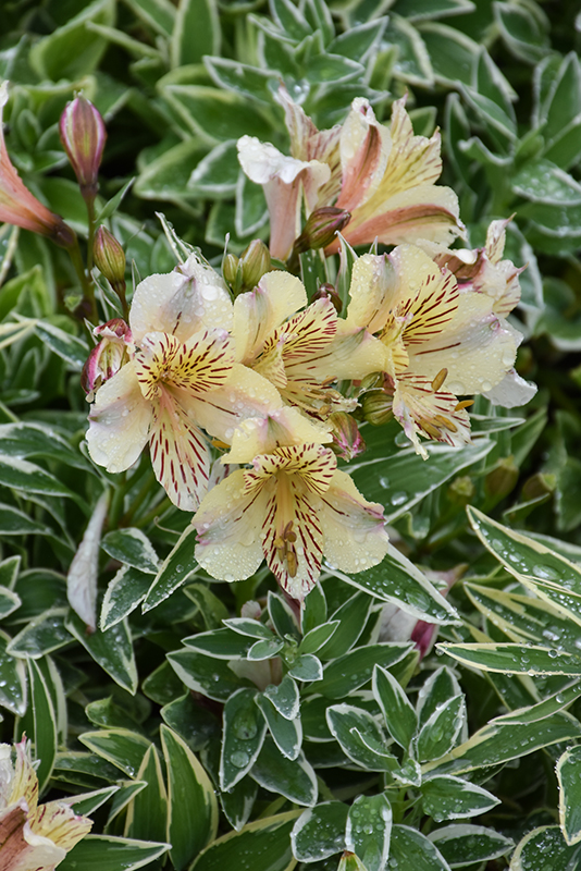 Colorita® Fabiana® Alstroemeria features showy bracted yellow trumpet-shaped flowers with creamy white overtones, buttery yellow throats and burgundy stripes at the ends of the stems from early summer to mid fall. The flowers are excellent for cutting. Its attractive twisted pointy leaves remain forest green in colour with distinctive white edges throughout the season.