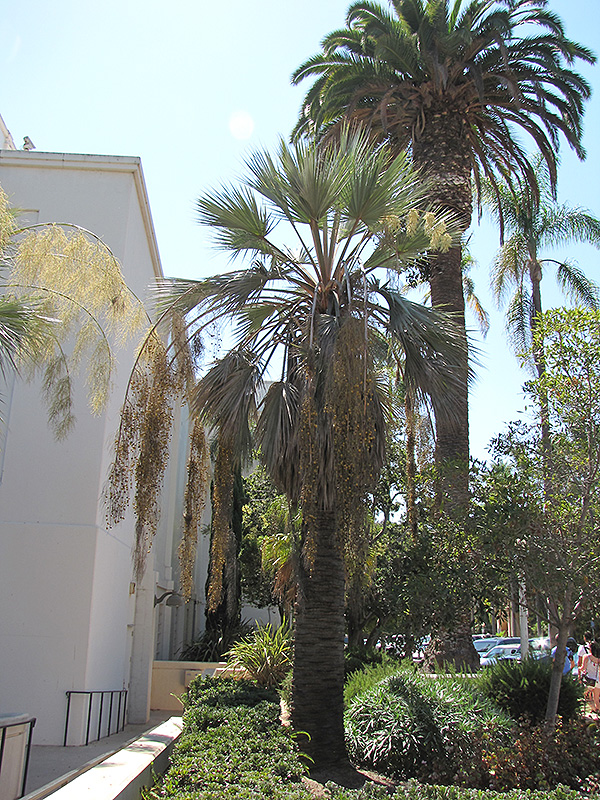 Mexican Blue Palm is draped in stunning clusters of chartreuse flowers with yellow overtones hanging below the branches from late winter to early spring. It has attractive grayish green foliage with hints of powder blue. The large fan-shaped palmate leaves are highly ornamental and remain grayish green throughout the winter. The gold fruits are held in abundance in spectacular clusters from early to mid summer. The fruit can be messy if allowed to drop on the lawn or walkways, and may require occasional clean-up. The rough dark brown bark is extremely showy and adds significant winter interest.