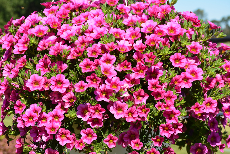 Aloha Cranberry Calibrachoa is blanketed in stunning hot pink trumpet-shaped flowers with yellow throats and a dark red ring at the ends of the stems from late spring to early fall. Its small pointy leaves remain green in colour throughout the season.