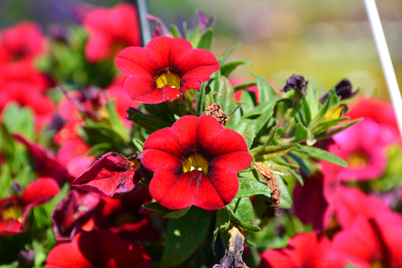 Aloha Nani Dark Red Calibrachoa is blanketed in stunning dark red trumpet-shaped flowers with yellow throats and a black ring at the ends of the stems from late spring to early fall. Its small pointy leaves remain green in colour throughout the season.