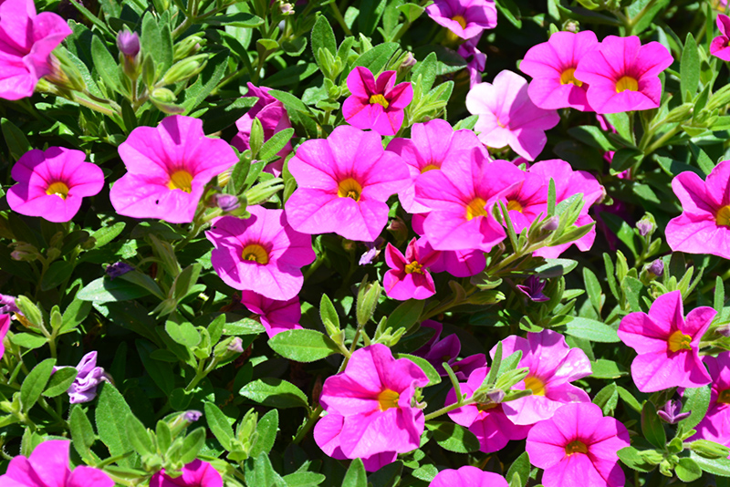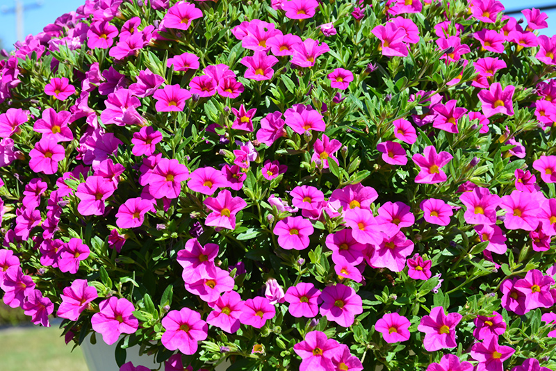 Aloha Nani Pink Calibrachoa is blanketed in stunning hot pink trumpet-shaped flowers with yellow throats at the ends of the stems from late spring to early fall. Its small pointy leaves remain green in colour throughout the season.